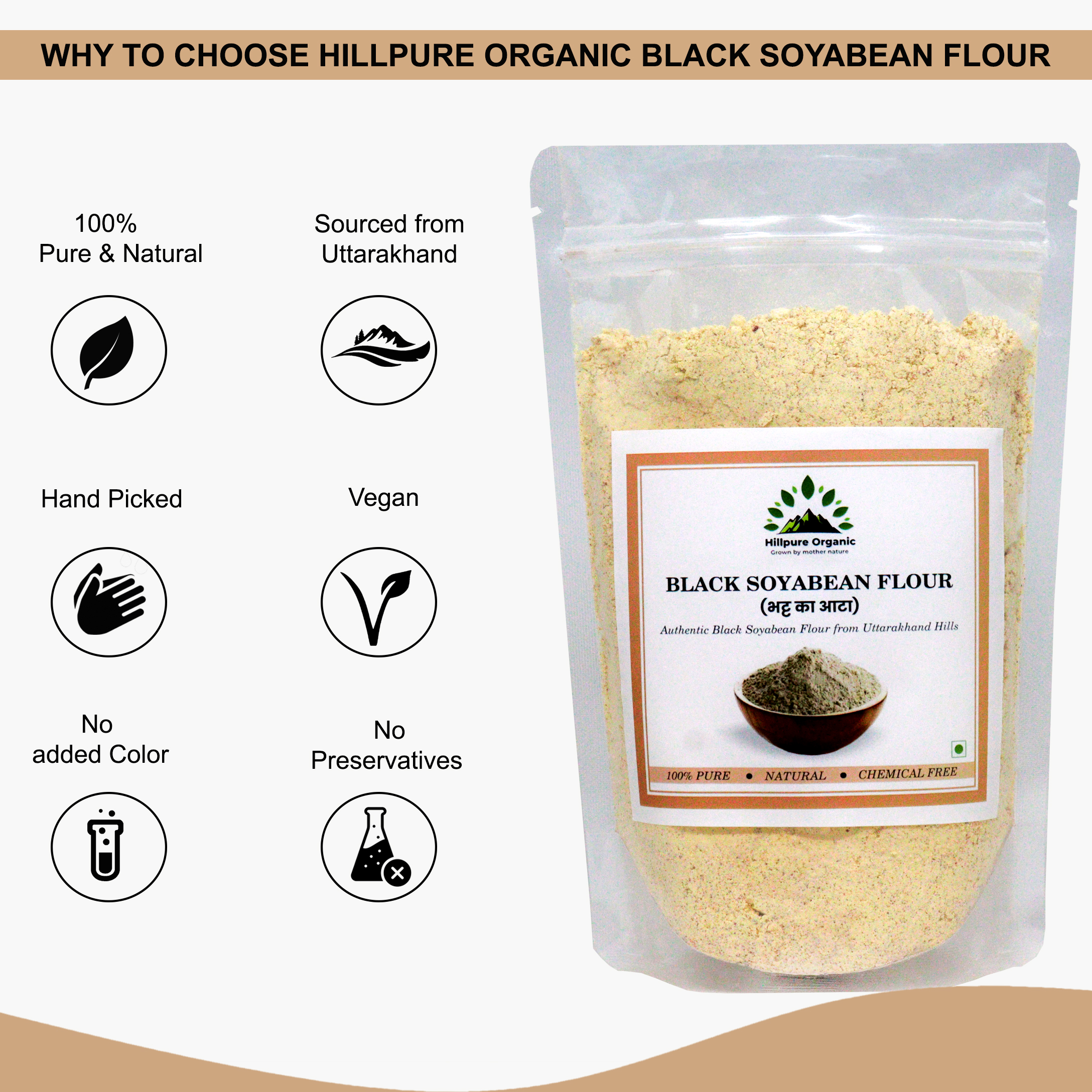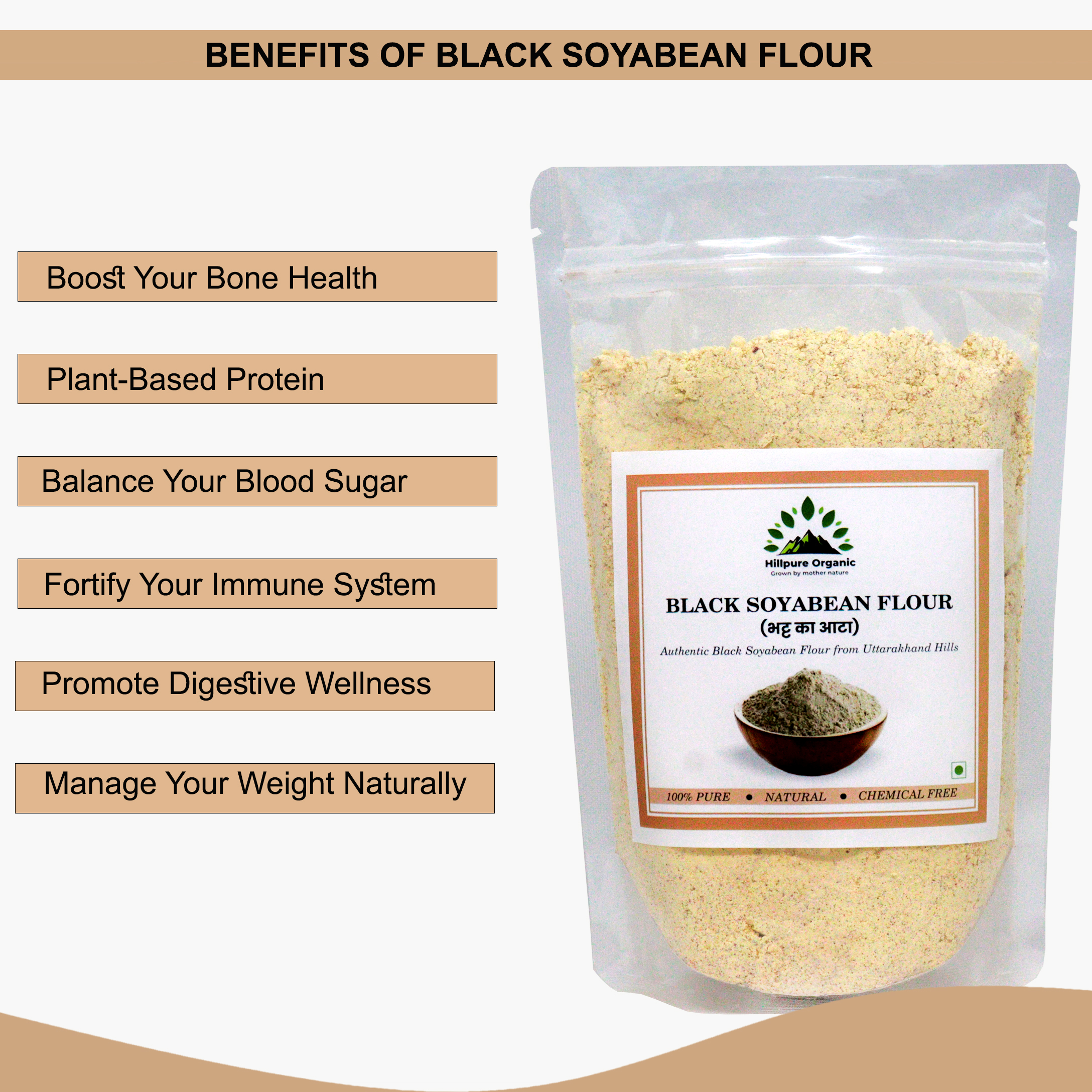 Hillpure Organic Black Soybean Flour ( bhatt ka atta ) is nutrient-rich and versatile addition to any kitchen. Its 100% pure & natural grown without synthetic pesticides or fertilizers, ensuring a pure and natural flavor. Packed with high-quality plant-based protein, fiber, and essential vitamins and minerals, they support a balanced diet and healthy lifestyle. Sourced from sustainably managed farms, Hillpure Organic Black Soybean Flour is a perfect choice for those seeking quality, flavor, and a commitment to environmental responsibility. Enjoy the wholesome goodness and robust nutrition of Hillpure Organic Black Soybean Flour, and take a step towards a healthier, more sustainable lifestyle.