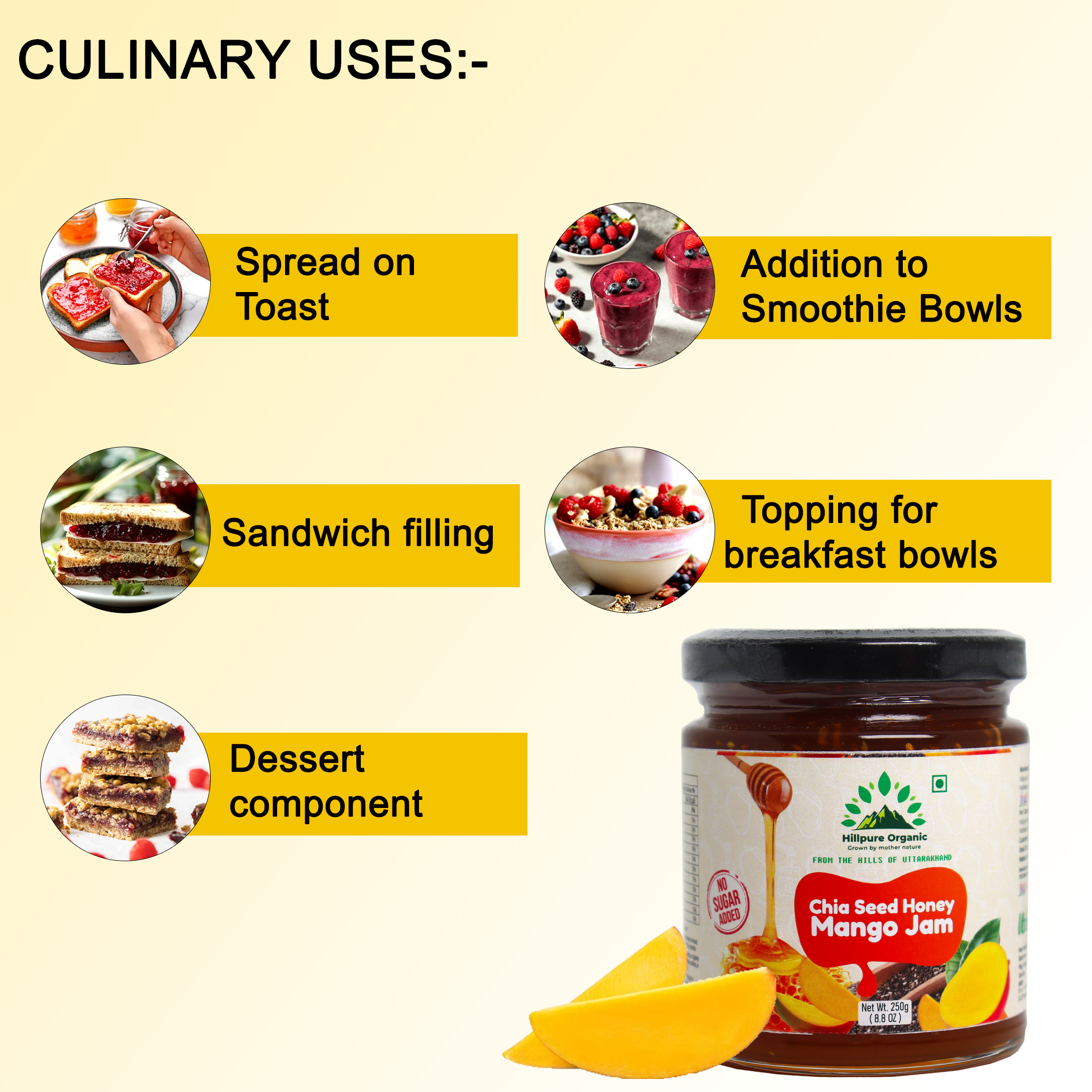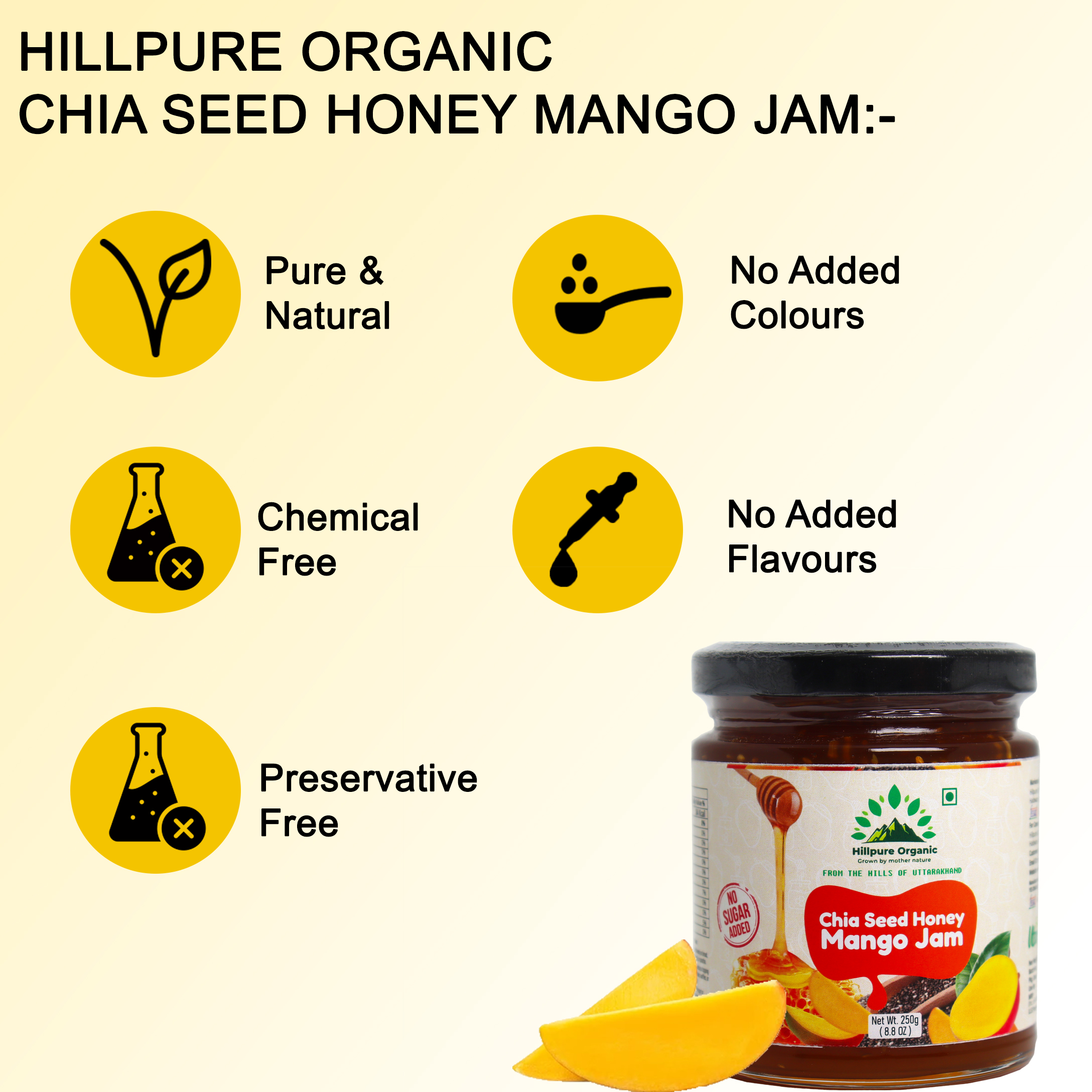 Hillpure Oranic Chia Seed Honey Mango Jam is a delicious blend of pure honey, ripe mango pulp, and nutrient-rich chia seeds. Crafted without refined sugar or artificial additives, this jam delivers the authentic sweetness of mango balanced with the smooth richness of honey. The soft crunch of chia seeds adds texture and makes this spread both enjoyable and wholesome. Ideal for breakfast and snacking, it pairs beautifully with bread, parathas, pancakes, yogurt, oats, and desserts. Prepared in small batches to maintain freshness and quality, this honey-based mango jam is a perfect choice for those seeking clean, natural, and flavourful food options.