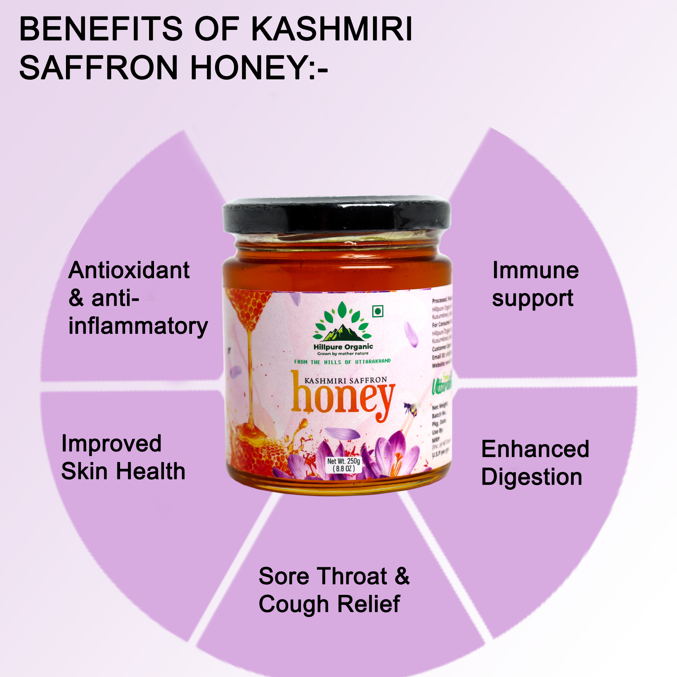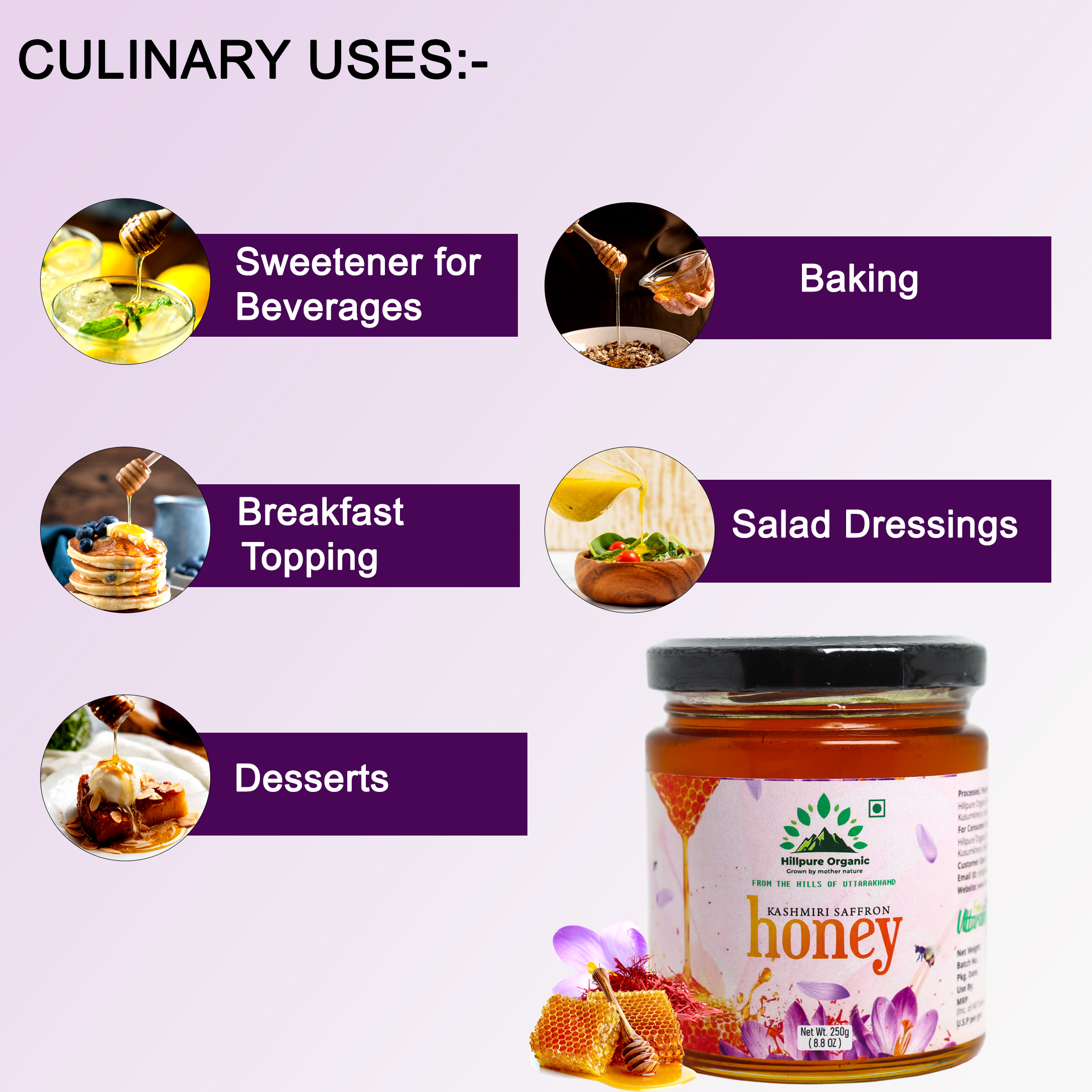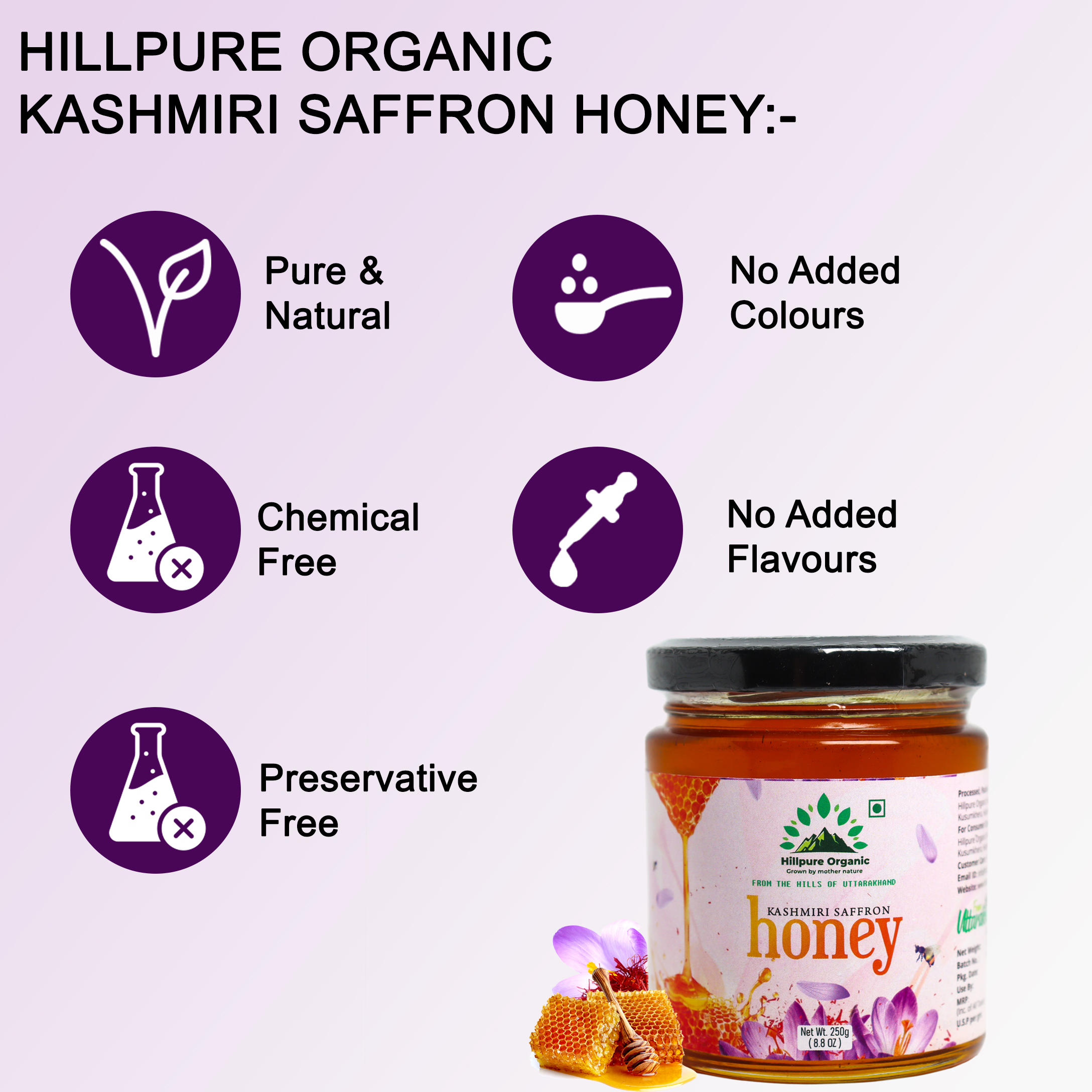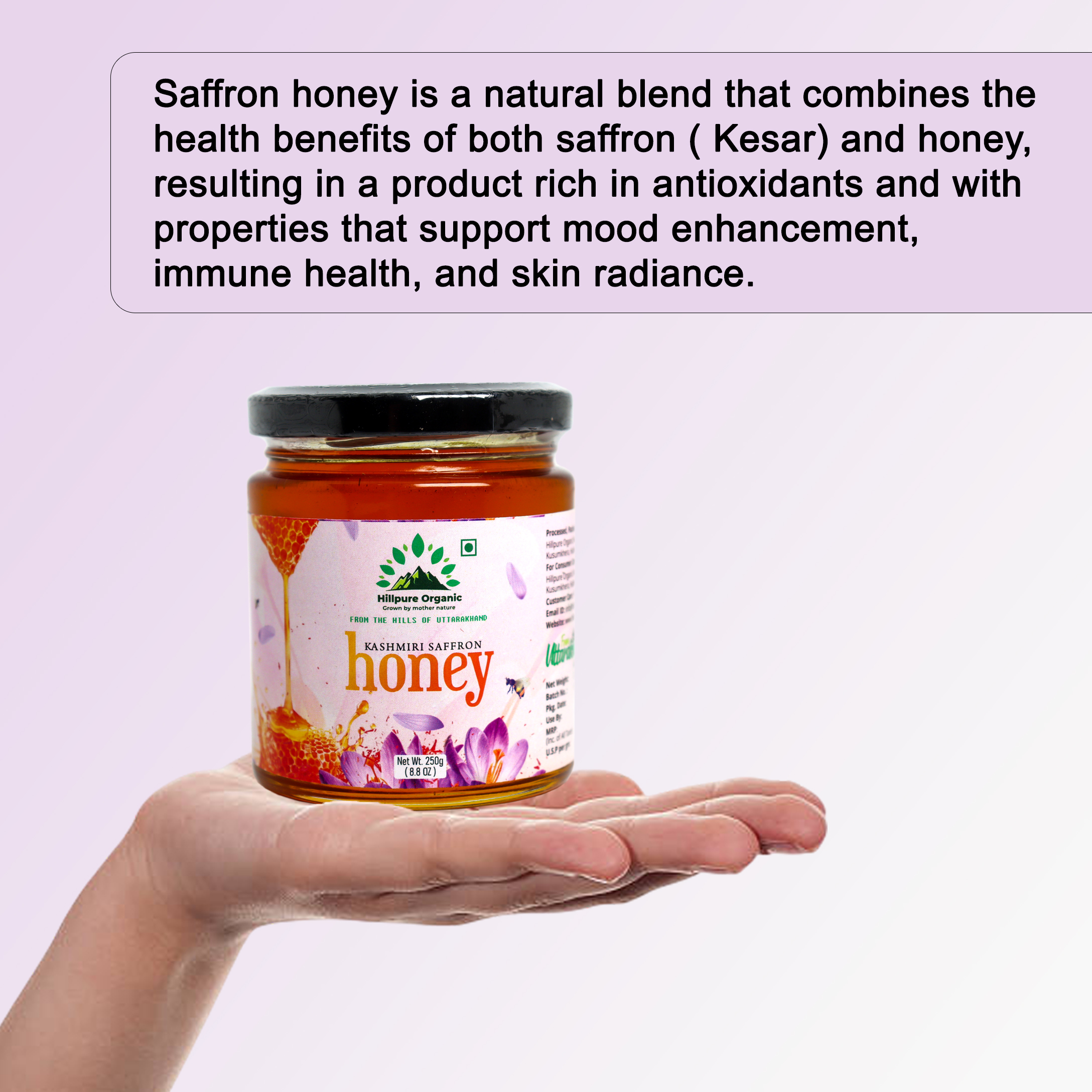 Saffron Honey is a premium variety of pure honey collected by bees foraging in areas close to saffron cultivation. The bee boxes are carefully placed near saffron flower fields, allowing bees to naturally gather nectar and produce honey with a subtle aroma and natural richness—without any artificial infusion or added saffron. Unprocessed and free from added sugar, this honey retains its natural enzymes and nutrients, making it a wholesome and authentic choice for everyday wellness and natural sweetness.